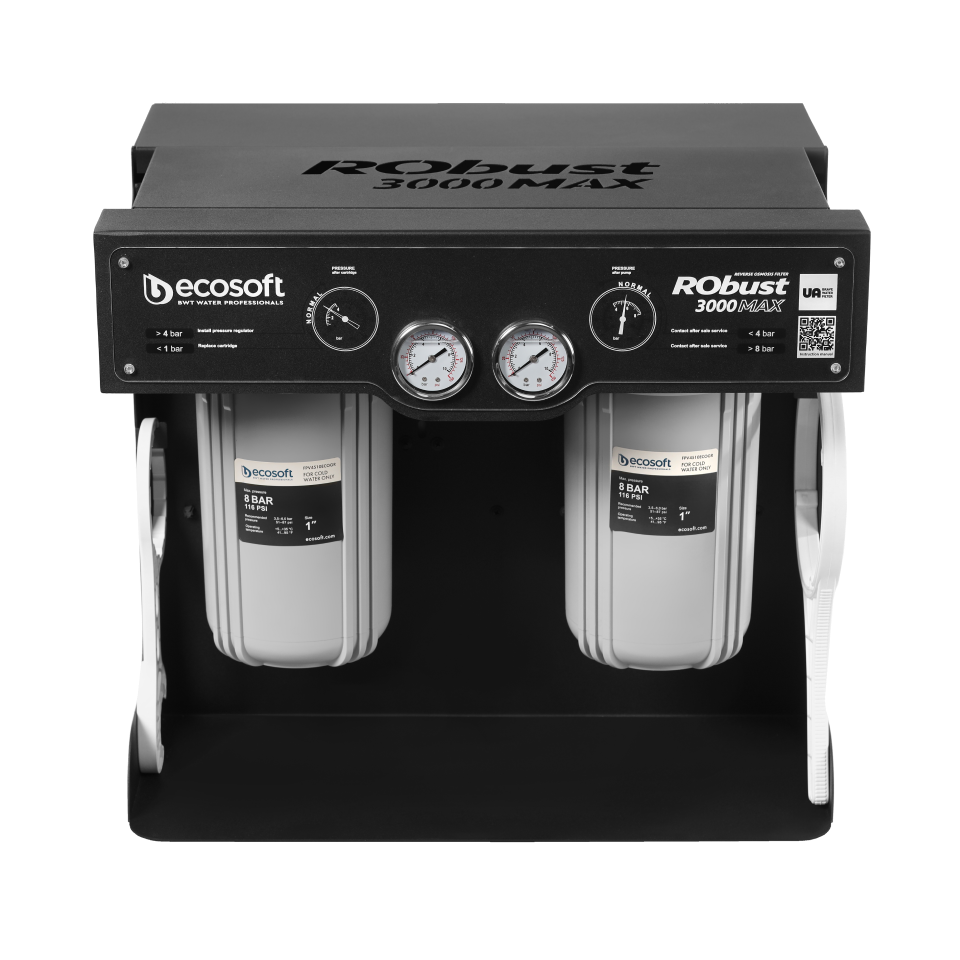 Ecosoft RObust 3000MAX is designed to supply purified water to various equipment, such as ice makers, steamers, ovens, dishwashers, dispensers, and more. This versatile system is ideal for installation in restaurants, water production facilities, small breweries, car washes, private homes, and other settings where high-quality water is essential.